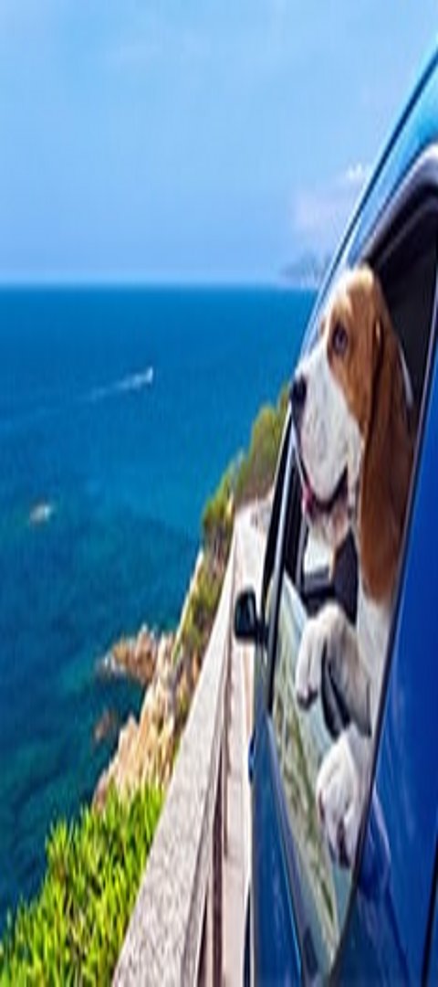 Ein fröhlicher Hund steckt den Kopf aus dem Fenster eines blauen Autos, das an einer Küstenstraße entlangfährt. Im Hintergrund sind das blaue Meer und ein klarer Himmel zu sehen Ein fröhlicher Hund steckt den Kopf aus dem Fenster eines blauen Autos, das an einer Küstenstraße entlangfährt. Im Hintergrund sind das blaue Meer und ein klarer Himmel zu sehen